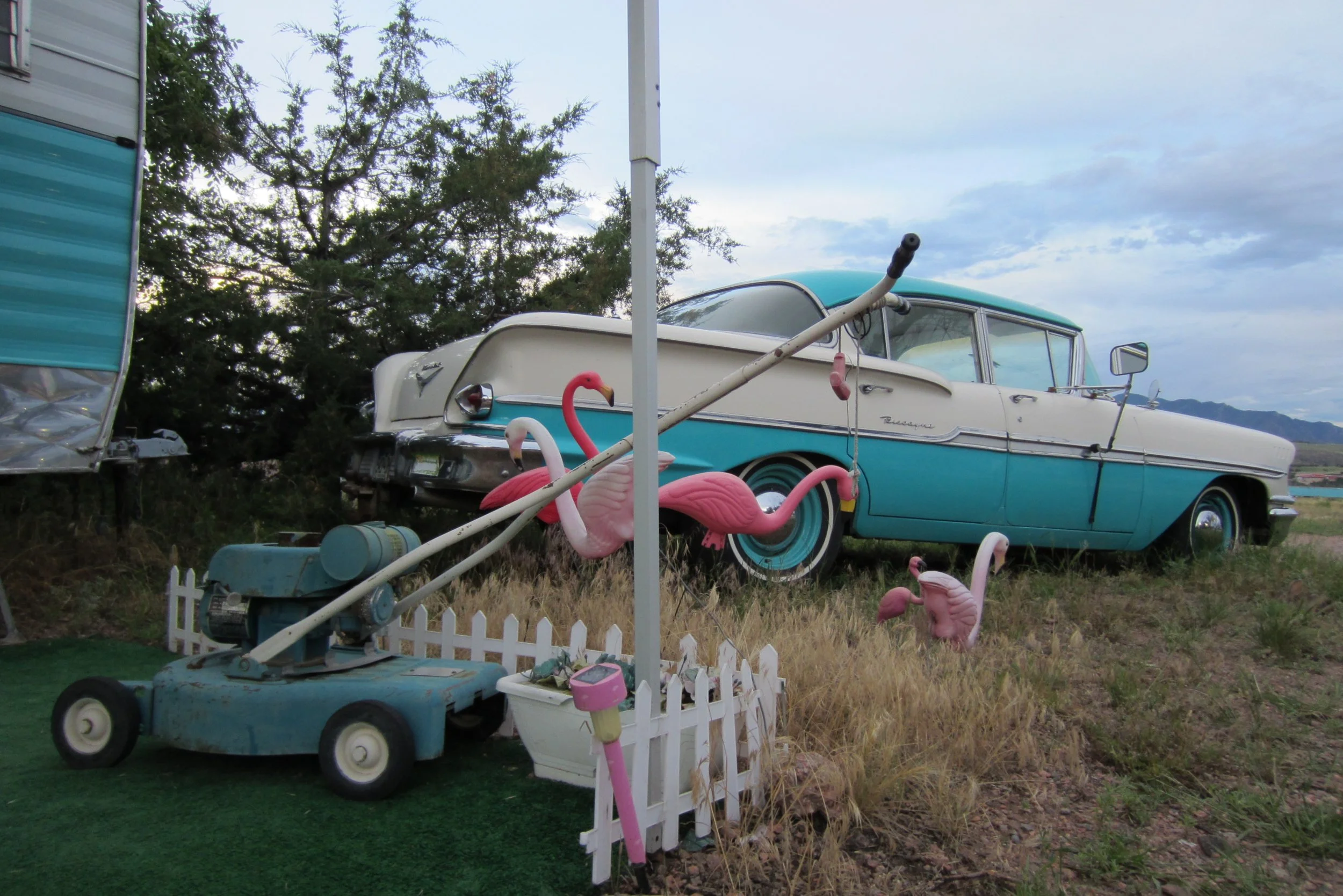 Larry’s Tepee Trailer, dubbed the Flamingo Lounge, is hitched to a 1958 Chevy Biscayne—and comes with plastic flamingos and matching powder blue lawnmower in the “front yard.”