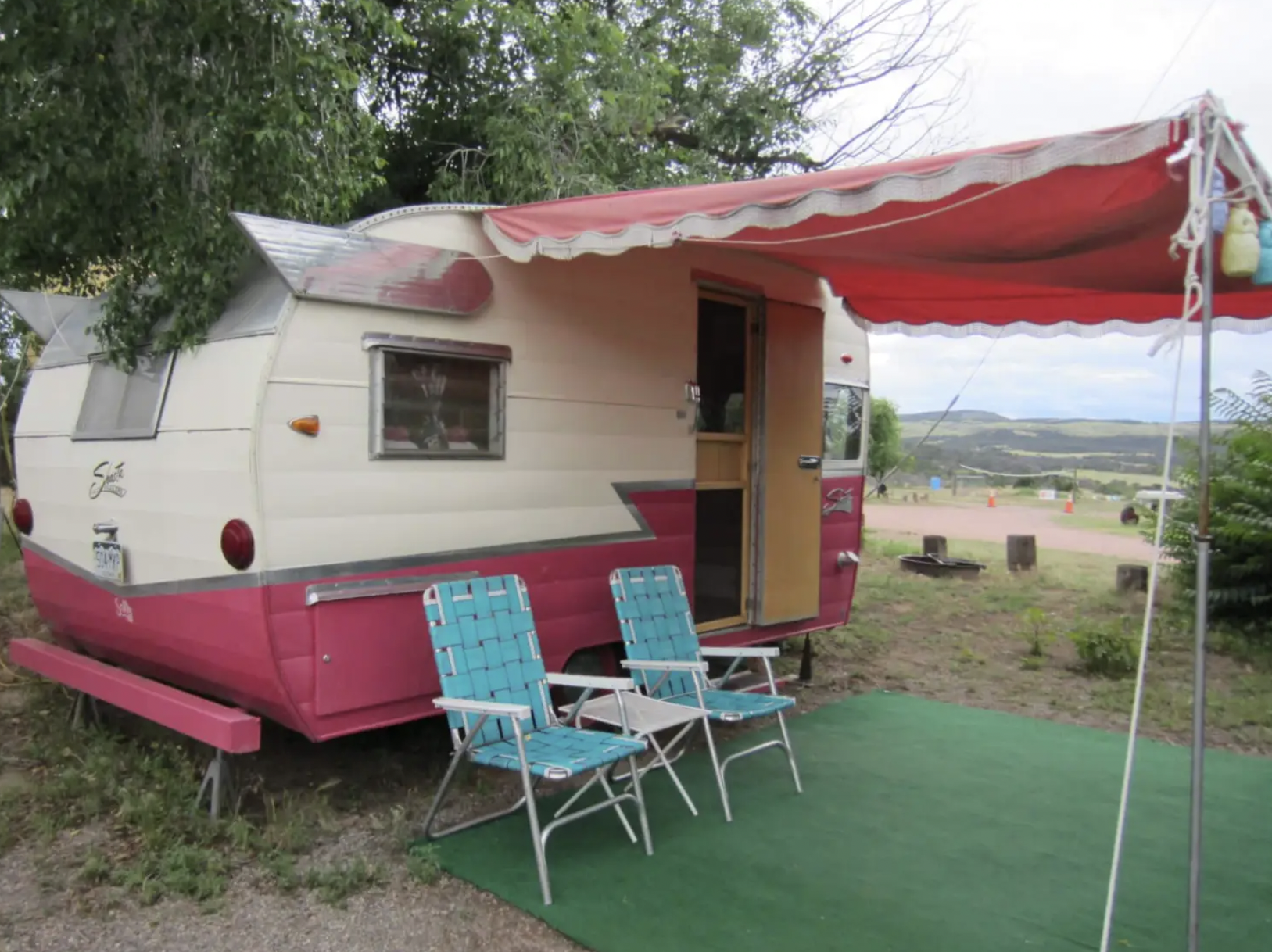 The trailers on the property sleep anywhere from two to six people, each with their own wacky theme. Each has its own front porch complete with your own patch of Astroturf and awning strung with party lights, along with vintage lawn chairs for sitting outside and sipping a cold beer.